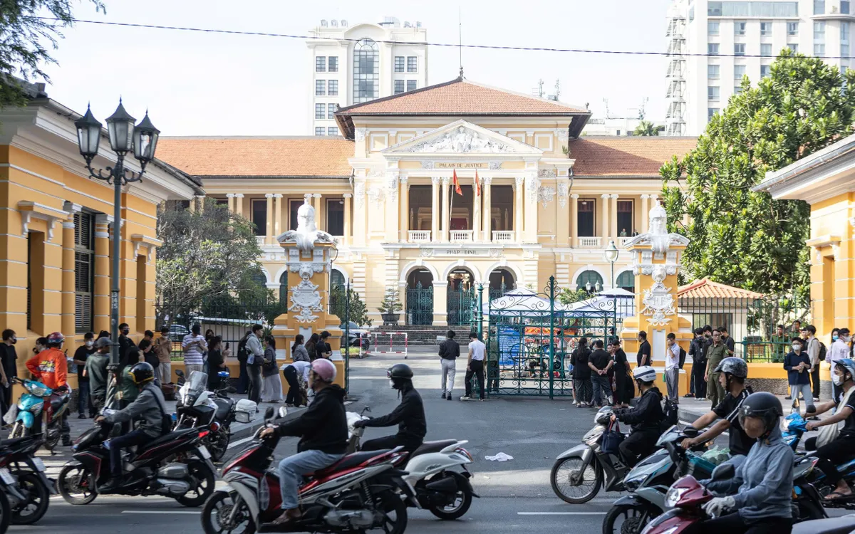 Từ sáng sớm, lực lượng cảnh sát được bố trí dọc cổng TAND TP Hồ Chí Minh để đảm bảo an ninh trật tự khu vực xét xử. Trên đường Nam Kỳ Khởi Nghĩa, trước cổng tòa, hàng rào được dựng lên nhằm hạn chế giao thông và ngăn người dân tụ tập.
