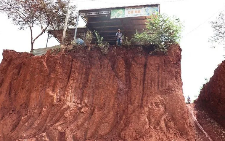 Ngôi nhà của người dân ở ấp Suối Nhung, xã Tân Lợi, cao hơn so với đường gần 9m, khi hạ cốt nền, thi công tuyến đường ĐT.753. (Ảnh: TTXVN)
