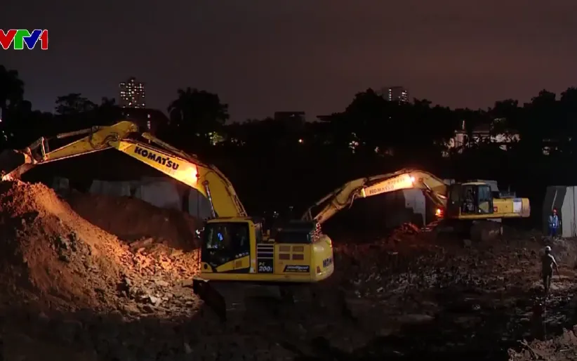Sau cơn mưa lớn, công trường Hồ Thụy Phương 2 trở nên lầy lội, bùn đất nhưng những chiếc máy xúc vẫn sáng suốt đêm. Đơn vị thi công đang quyết tâm đảm bảo từng mét tiến độ, để hoàn thành đúng thời hạn trươc mùa mưa năm nay.
