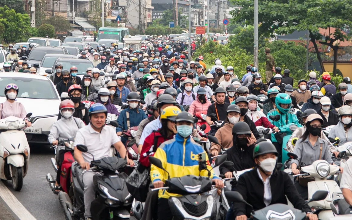 Các ngõ nhỏ, đường dân sinh quanh khu vực đê trở thành lối thoát tạm cho dòng xe máy. Nhiều đoạn hẹp chỉ đủ cho một xe đi qua, khiến việc di chuyển gặp nhiều khó khăn. (Ảnh: VOV)