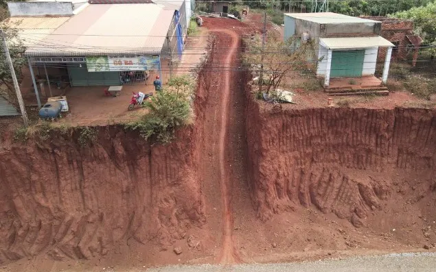 Từng là nhà mặt tiền đường, nhưng hiện nhà ông Dửng (xã Tân Lợi, tỉnh Đồng Nai) cheo leo như đang trên đỉnh đồi. Những chiếc hố khoét sâu dựng đứng tạo thành những hiểm nguy chực chờ. Gần nửa đời người mới có được căn nhà, nhưng ông phải xót xa chia tay để tạm trú nơi khác trong sự hoang mang.