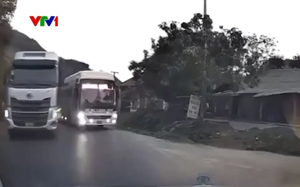 Chiếc xe con gắn camera hành trình sắp tới một khúc cua gấp, tầm nhìn hoàn toàn bị che khuất. Vừa vào khúc cua, tài xế bất ngờ phát hiện từ hướng ngược lại, chiếc xe khách đang vượt một đoàn xe đi cùng chiều. Không còn cách nào khác tài xế xe con phải đánh hết lái sang trái nép vào hành lang trống bên phải đường để tránh va chạm có thể xảy ra trong tích tắc.