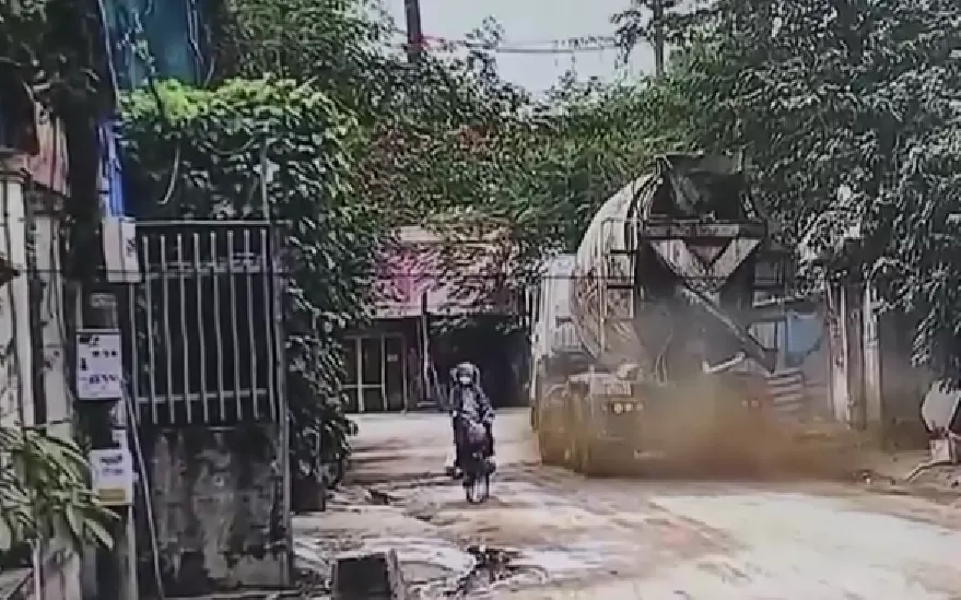 Không chỉ có các xe chở đất, xe bê tông cũng chạy rất nhanh trong con ngõ nhỏ, vừa gây ô nhiễm mà còn nguy cơ mất an toàn giao thông. Lượng xe bê tông di chuyển cũng nhiều không kém gì những xe tải chở đất, liên tục cuộn bụi vào các nhà dân ven đường.