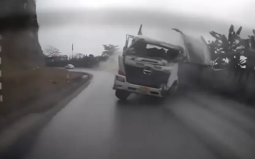 Hình ảnh được camera hành trình phía sau của một chiếc ô tô ghi lại cho thấy đoạn đèo dốc khá quanh co. Chiếc xe tải có dấu hiệu mất kiểm soát lao xuống với tốc độ cao. Tránh được chiếc xe máy đi ngược chiều nhưng chiếc xe tải cũng va quệt nhẹ với một xe tải khác trước khi lao vào vệ đường phía ta luy âm. May mắn chiếc xe không lao xuống mà bật ngược trở lại phía vách núi và lật nghiêng.