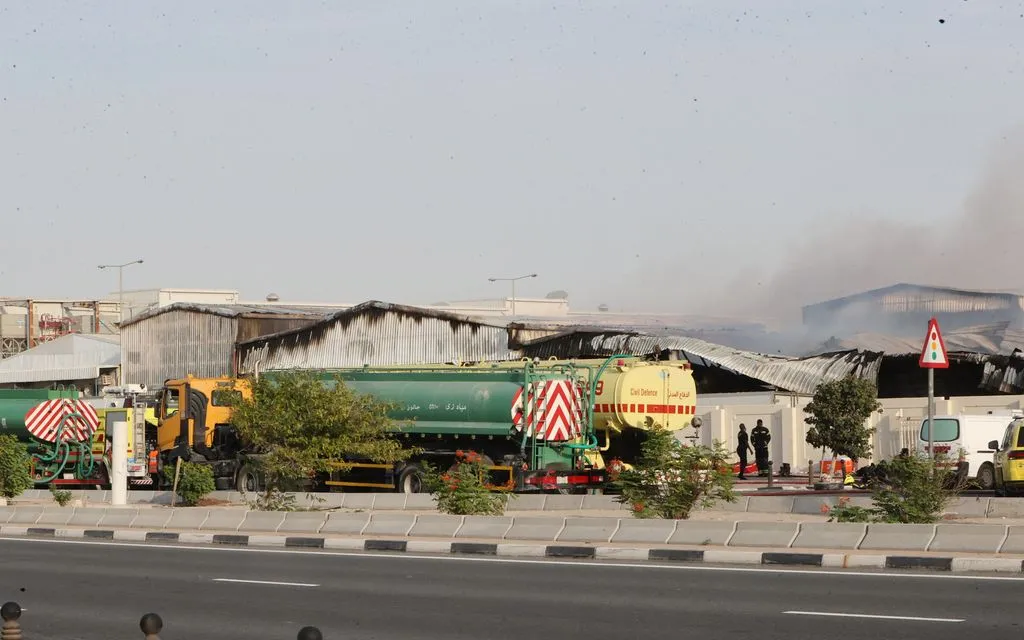 Các nhân viên cứu hỏa làm việc bên ngoài một nhà kho bị hư hại tại khu công nghiệp Al Rayyan, Qatar, sau cuộc tấn công của Iran, ngày 1/3/2026 (Ảnh: AP)