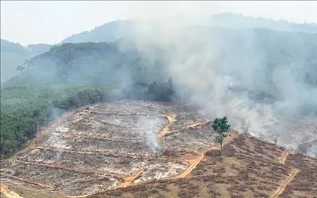 Do ảnh hưởng của thời tiết nắng nóng, kết hợp việc đốt dọn thực bì sau khai thác, ngọn lửa nhanh chóng bùng phát và lan rộng, với diện tích cháy ước khoảng 2 ha. Ảnh: TTXVN