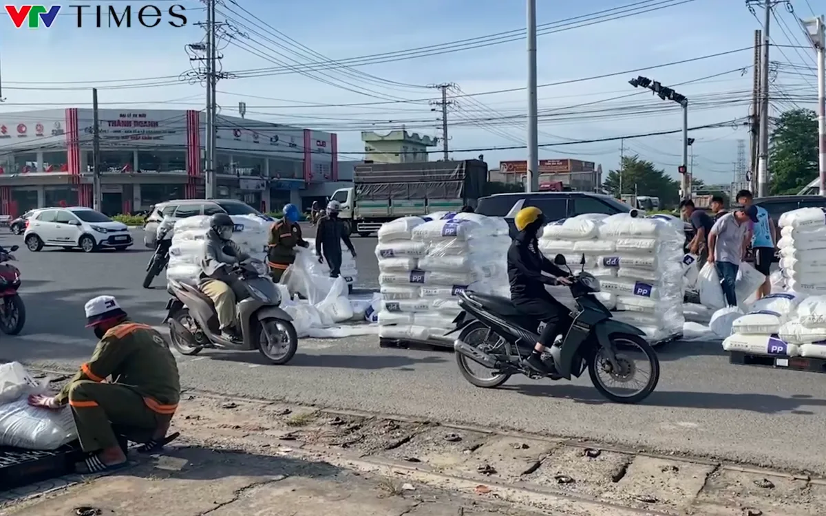 Xe đầu kéo ôm cua từ cảng ra QL 51 làm rơi hơn 700 bao hạt nhựa xuống đường, gây ùn ứ giao thông tại ngã ba cảng Cái Mép.
