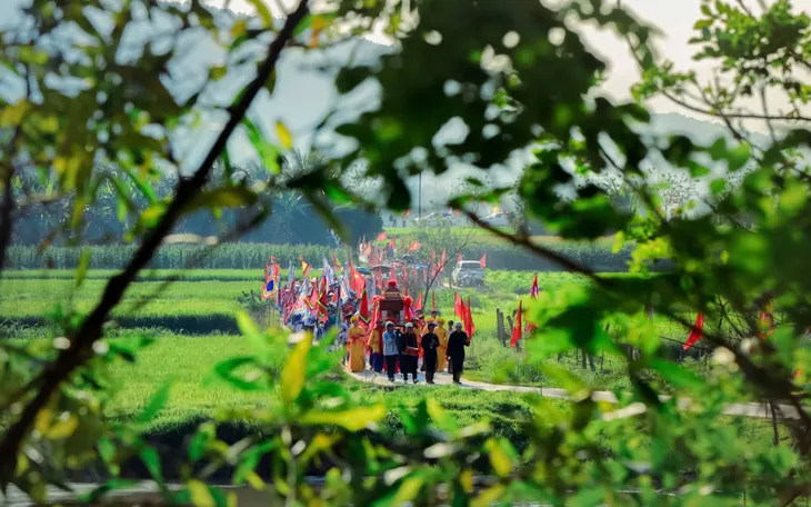 Đoàn rước nối dài giữa cánh đồng trong Lễ hội Bà Thu Bồn 2026.
