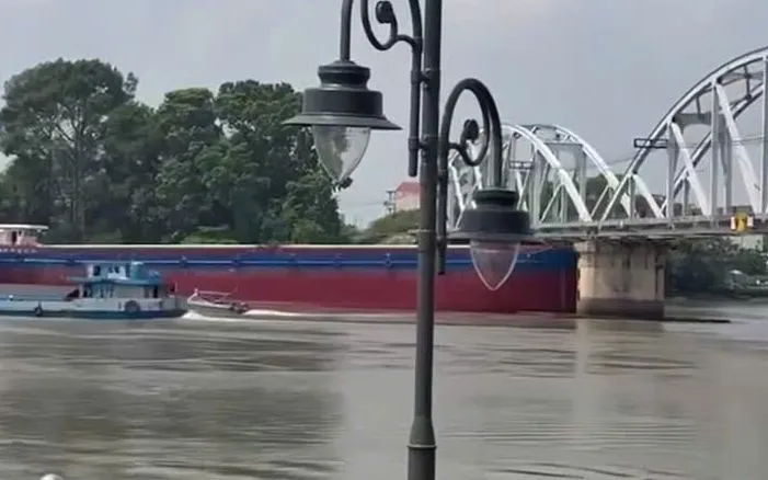 Hiện trường sà lan đâm cầu Gềnh khiến tuyến đường sắt Bắc - Nam tê liệt.