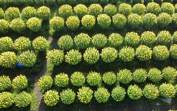 Hàng nghìn chậu hoa xếp thành từng dãy ngay ngắn, sắc vàng trải rộng, báo hiệu mùa vụ cao điểm đã đến.