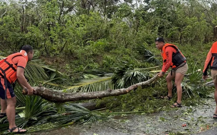 Lực lượng Bảo vệ Bờ biển Philippines dọn dẹp cây đổ ở Virac, Catanduanes khi bão Fung-wong đổ bộ gây ảnh hưởng, ngày 9/11/2025 (Ảnh: AP)
