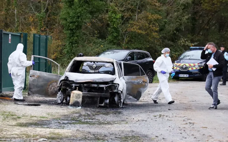 Nhân viên điều tra làm việc bên cạnh chiếc xe bị cháy tại Saint-Pierre-d’Oléron, Pháp, ngày 5/11/2025 (Ảnh: AP)