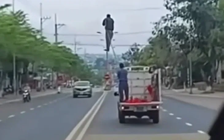 Đáng chú ý, khi xe đang chạy, có 1 người đứng trong thùng xe, 1 người khác đứng trên khung sắt được cố định bên hông xe tiềm ẩn nguy cơ mất an toàn giao thông. Sự việc này đã được người dân ghi lại, phát tán trên mạng xã hội.