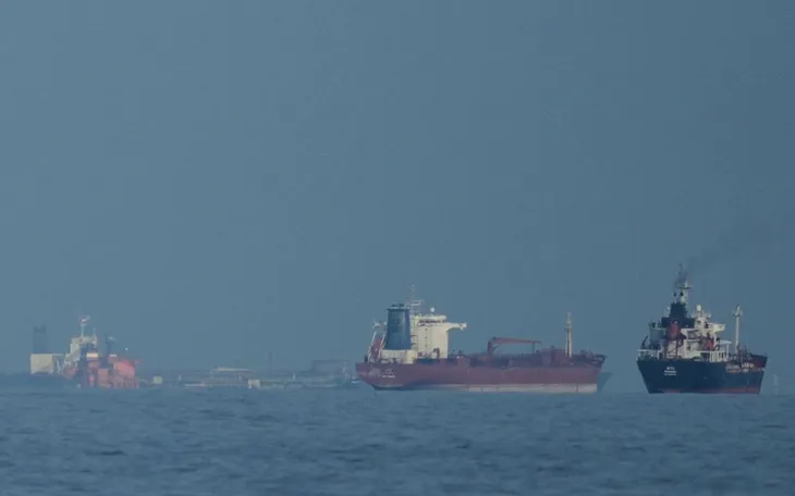 Các tàu chở dầu và tàu chở hàng xếp hàng dài ở eo biển Hormuz (Ảnh: AP)