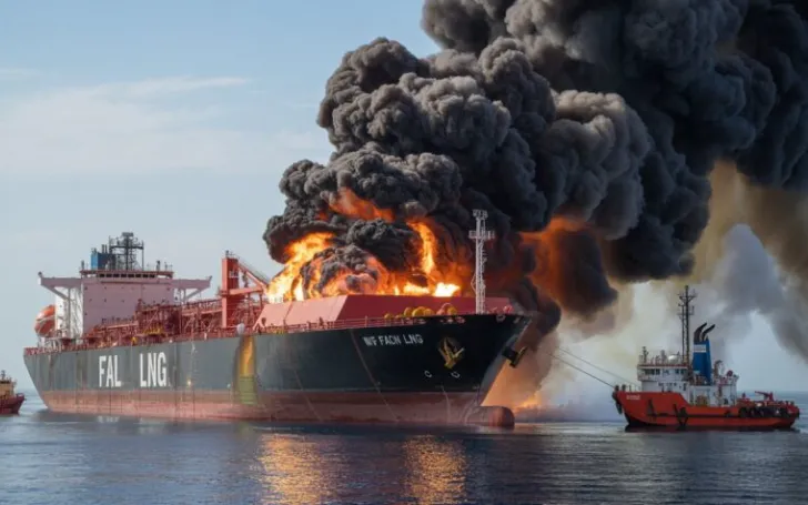 Các quan chức Anh và Liên minh châu Âu đưa ra nhiều ý kiến khác nhau về nguyên nhân gây ra vụ cháy trên tàu Falcon. Phía Anh cho rằng tàu đã bị trúng đạn pháo, trong khi EU tin rằng đây dường như là một tai nạn. Họ cảnh báo các tàu trong khu vực rằng tàu có thể phát nổ vì nó chở đầy khí đốt hóa lỏng.