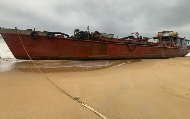 Con tàu bị sóng đánh tấp vào bờ biển Quảng Ngãi.