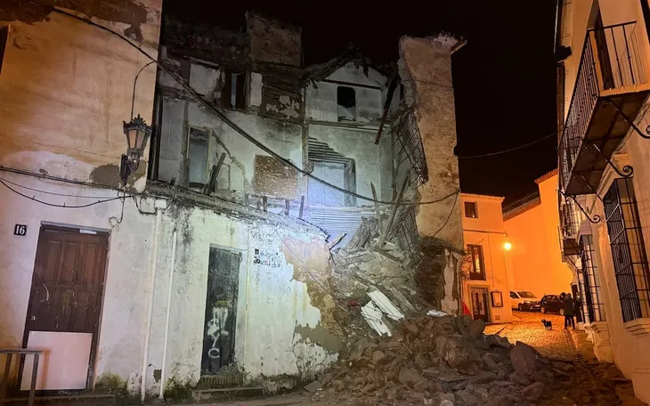 Người dân đứng cạnh phần mặt tiền ngôi nhà bị sập do mưa lớn tại Ronda, Tây Ban Nha, ngày 10/2/2026 (Ảnh: Reuters)