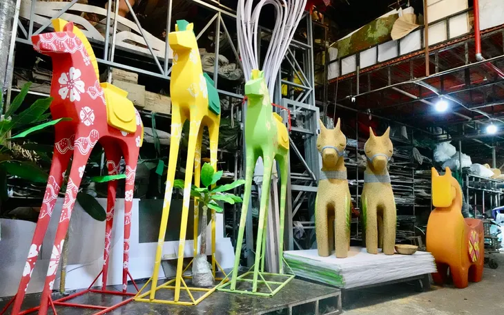 Xưởng chế tác Văn Tòng cũng chính là nơi từng thực hiện cặp đôi linh vật Kim Tỵ - Ngân Tỵ cùng robot trò chuyện với du khách cho Đường hoa Nguyễn Huệ Tết Ất Tỵ. Năm nay, không khí lao động tại xưởng trở nên khẩn trương hơn bao giờ hết khi tiến độ thi công bước vào giai đoạn nước rút.
