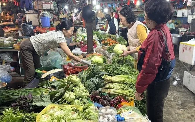 Người dân mua rau tại chợ Nhân Chính, phường Thanh Xuân, thành phố Hà Nội. Ảnh: Quốc Lũy/TTXVN