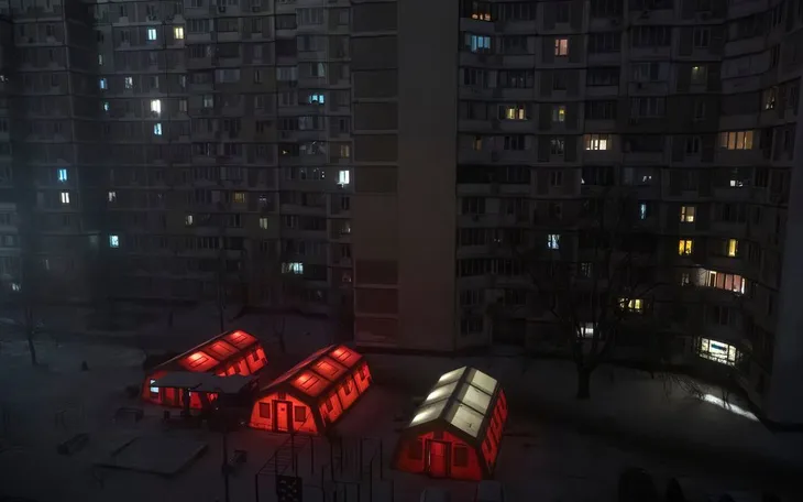 Các lều cứu trợ khẩn cấp được dựng lên trong một khu dân cư ở Kiev, để người dân có thể sưởi ấm sau các cuộc không kích thường xuyên của Nga, ngày 15/1/2026 (Ảnh: AP)