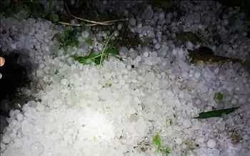 Những cơn mưa đá trút xuống, tạo thành đống tại xã Bảo Lâm (Cao Bằng) chiều tối 31/3. Ảnh: TTXVN