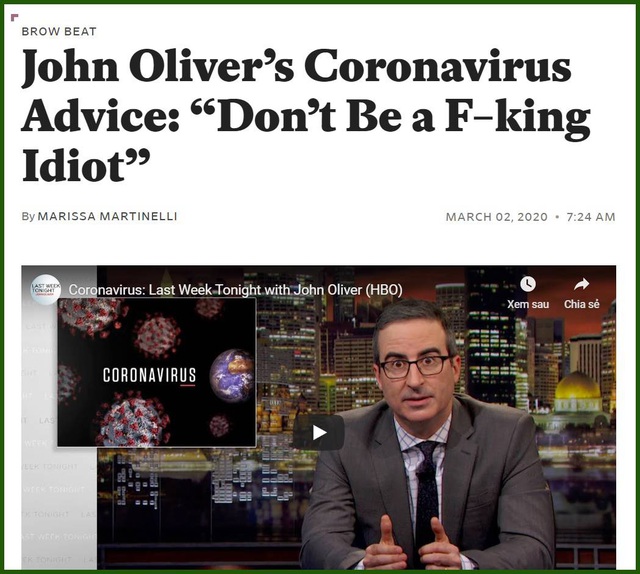 MC của chương trình - nam diễn viên hài John Oliver - đã kết thúc tập phát sóng mới nhất xoay quanh chủ đề về dịch Covid-19 bằng một vũ điệu rửa tay do chính ông thực hiện không kém phần hài hước, dễ thương so với các bạn trẻ.