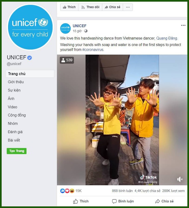 Trên tài khoản Facebook chính thức của Quỹ Nhi đồng Liên Hiệp Quốc UNICEF, vũ điệu rửa tay của Quang Đăng được giới thiệu. Đăng tải này đã nhận về hơn 15.000 lượt tương tác cảm xúc, gần 1.000 lượt bình luận, 4.500 lượt chia sẻ và 300.000 lượt xem chỉ sau 15 giờ đăng tải. Những con số này đã cho thấy vũ điệu rửa tay trên nền giai điệu “Ghen cô Vy” đang hấp dẫn cộng đồng mạng quốc tế như thế nào.