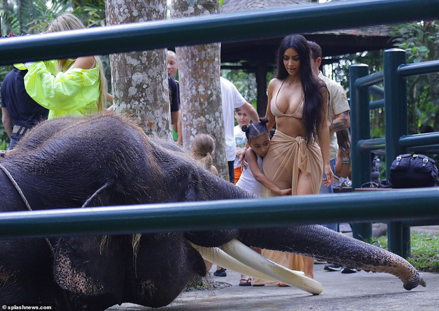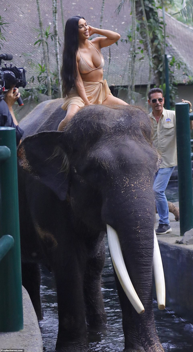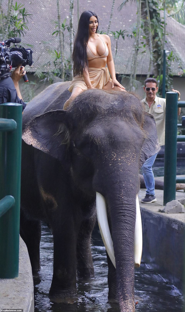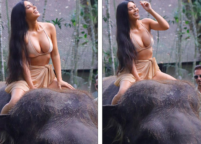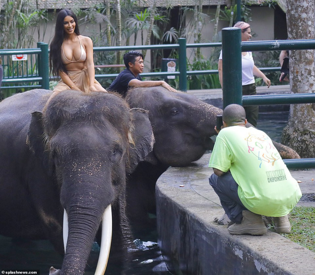 Kim Kardashian diện bikini cưỡi voi trong kỳ nghỉ cùng gia đình tại Bali, Indonesia. Những hình ảnh này sẽ xuất hiện trong những tập phim mới của show truyền hình thực tế của cả gia đình Kardashian.