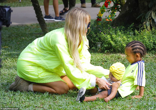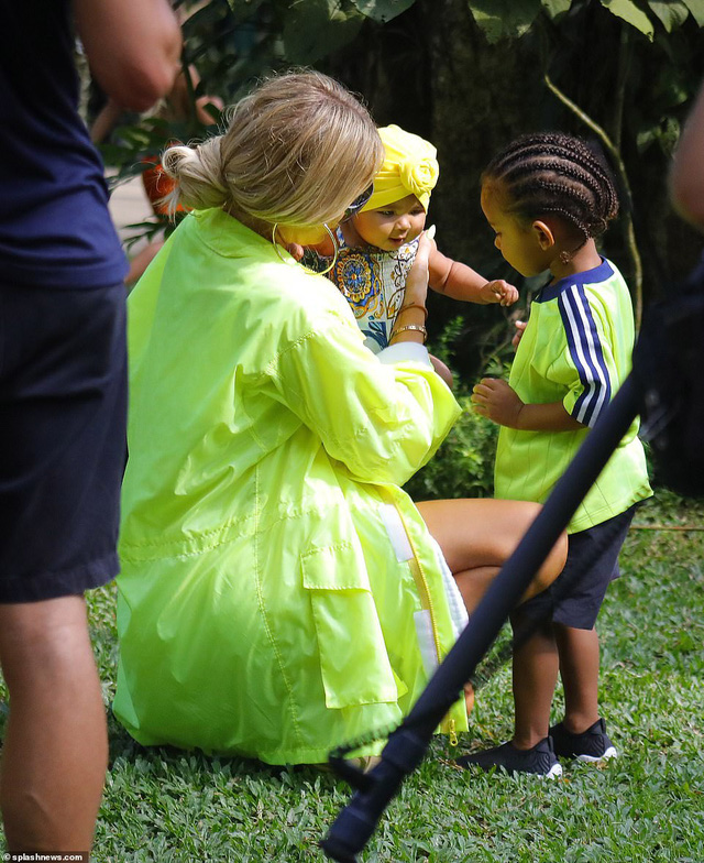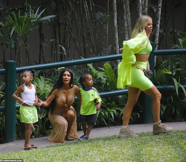 Hai mẹ con Khloe và True diện đồ đôi với gam màu vàng neon nổi bật.