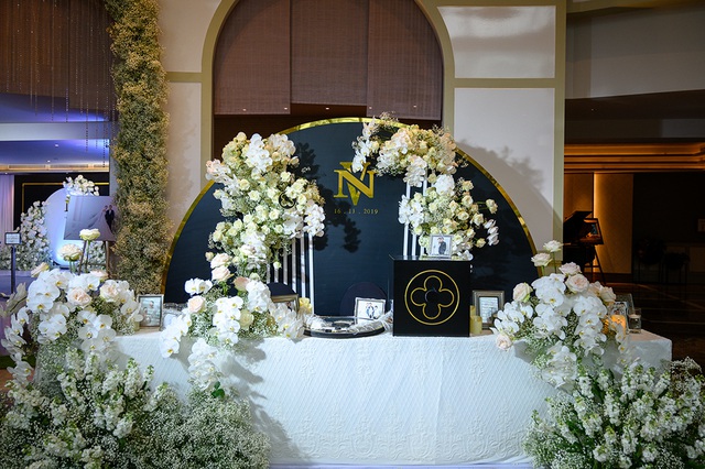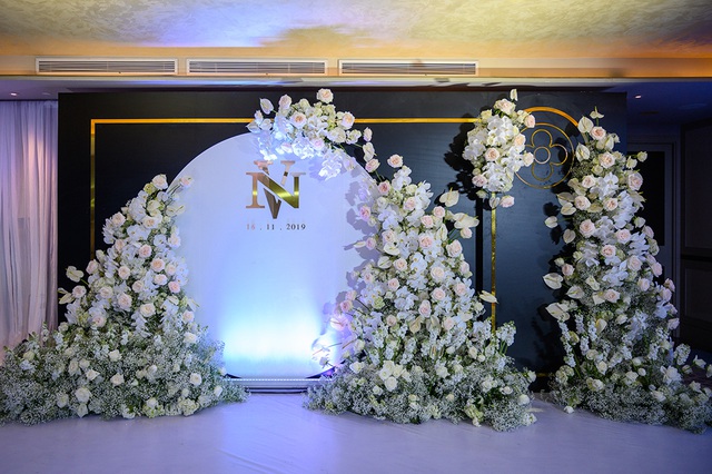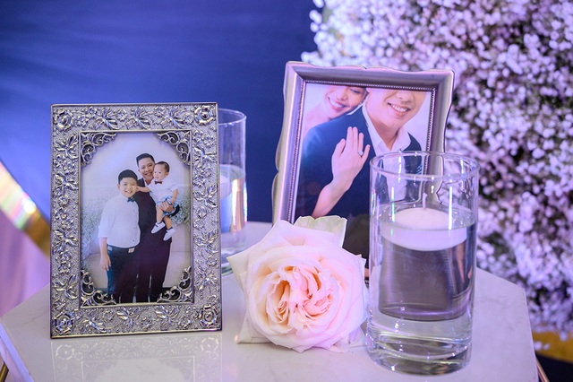 Không gian tiệc cưới được trang trí toàn bộ hoa trắng, hình ảnh gia đình của Giang Hồng Ngọc được đặt khá trang trọng.
