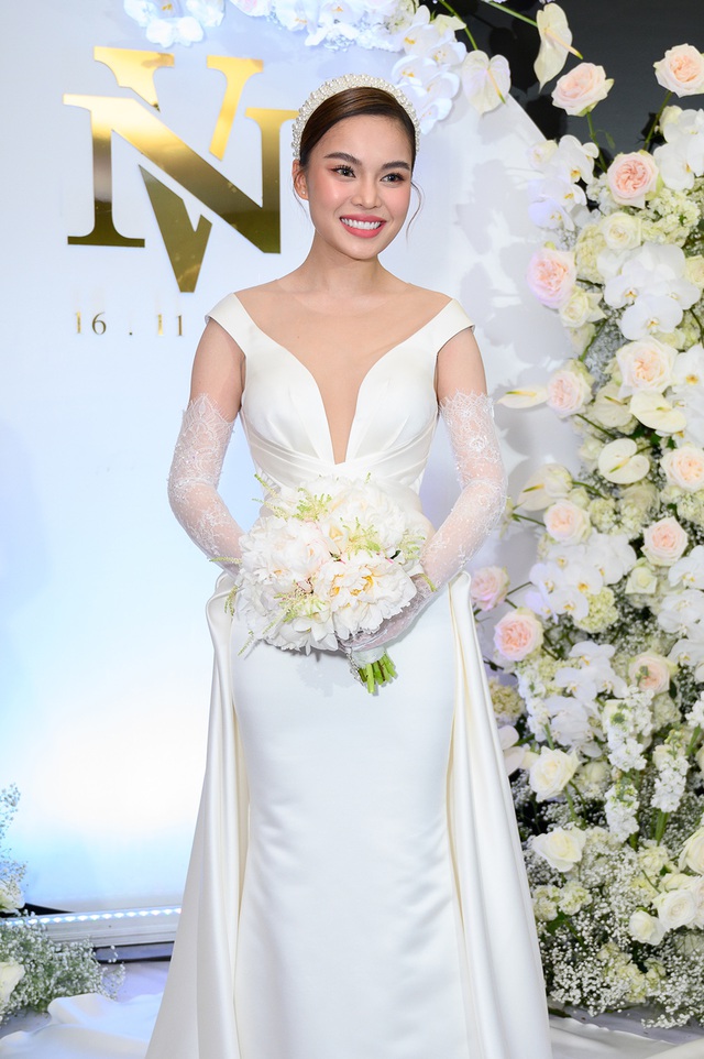 Cô dâu Giang Hồng Ngọc đẹp xinh tươi trong chiếc váy trắng được thiết kế đơn giản, với những đường cắt xẻ vừa đủ để cô dâu khoe nét đẹp gợi cảm của mình.