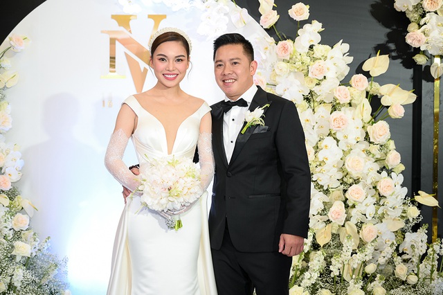 Chú rể Xuân Văn bảnh bao với vest đen lịch lãm. Giang Hồng Ngọc chia sẻ, cô chọn người hiện tại làm chồng bởi cả hai rất yêu thương nhau. Dù đã có với nhau một cậu con trai nhưng quyết định khiến cô đi đến hôn nhân và gắn bó cùng anh chính là vì tình yêu.
