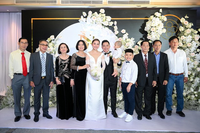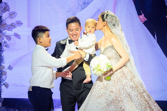 Đặc biệt, cậu con trai 1 tuổi của cặp đôi - bé Cà Rốt cũng xuất hiện trên sân khấu cùng bố mẹ trong tiệc cưới.