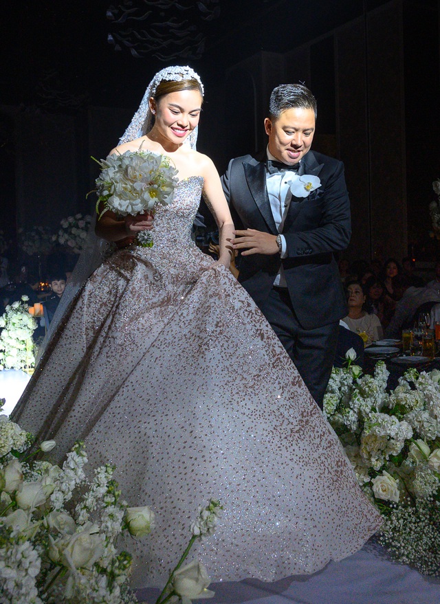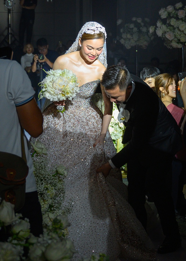 Nữ ca sĩ thay bộ soiree kim tuyến lấp lánh khi chuẩn bị làm lễ. Chú rể Xuân Văn dìu cô dâu Giang Hồng Ngọc lên sân khấu để thực hiện nghi thức chính của hôn lễ.