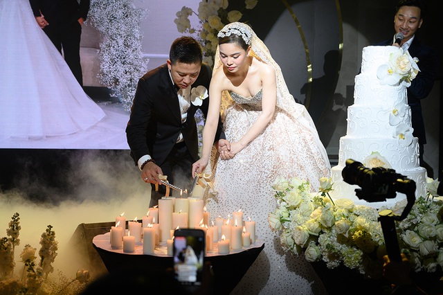 Cặp đôi thắp những ngọn nến lung linh trên sân khấu để bắt đầu thực hiện nghi thức hôn lễ.