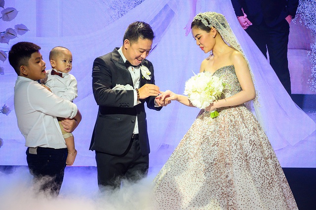 Bé trai xuất hiện bên cạnh vợ chồng Giang Hồng Ngọc và cả ảnh cưới của gia đình giúp Giang Hồng Ngọc và chồng giữ con. Con trai nhỏ chứng kiến khoảnh khắc bố mẹ đeo nhẫn cưới cho nhau trên sân khấu.