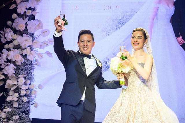 Giang Hồng Ngọc và chồng nâng ly rượu giao bôi để cùng nhau bước vào cuộc sống mới. Cảm ơn sự có mặt và chúc phúc của đông đảo khách mời.