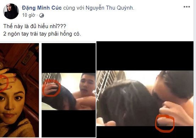 Nữ diễn viên Minh Cúc, người thủ vai tình địch của Huệ (Thu Quỳnh đóng) trong phim “Về nhà đi con” cũng lên tiếng thanh minh giúp đồng nghiệp. “Thế này là đủ hiểu nhỉ? 2 ngón tay trái tay phải không có”, Minh Cúc viết. Kèm theo đó, Minh Cúc đăng tải hình ảnh ngón tay áp út của Thu Quỳnh có hình xăm còn cô gái trong clip thì không có.