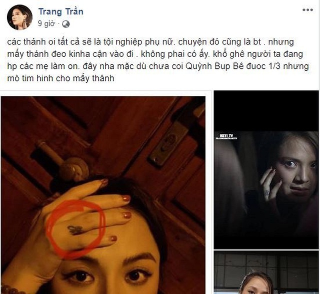 Người mẫu Trang Trần cũng chia sẻ trên trang cá nhân: “Các thánh ơi tất cả sẽ là tội nghiệp phụ nữ. Chuyện đó cũng là bình thường. Nhưng mấy thánh đeo kính cận vào đi. Không phải cô ấy. Khổ ghê người ta đang hạnh phúc...”