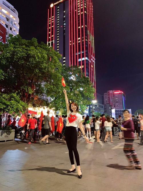 Diễn viên Thúy Ngân phim "Gạo nếp gạo tẻ" hạnh phúc mừng Việt Nam chiến thắng trên phố đi bộ Nguyễn Huệ.
