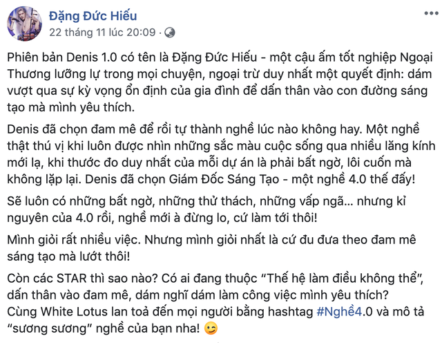 Xuất thân là một cử nhân khoa Tài chính – Ngân hàng của Trường Đại học Ngoại thương, Denis Dang - cái tên tưởng lạ mà quen, chính là cha đẻ của hàng loạt những MV triệu view, gây xôn xao cộng đồng giới trẻ thời gian qua như Ghen, Màu nước mắt, Mời anh vào tim em, Chị ngã em nâng... Bất chấp sự phản đối dữ dội từ bố mẹ, Denis Dang quyết tâm đi theo con đường nghệ thuật, bắt đầu từ việc từ việc làm người mẫu ảnh, giờ đây, người ta biết đến chàng trai này với vai trò là Giám đốc sáng tạo, người đã bỏ túi rất nhiều MV ca nhạc được đánh giá cao về hình ảnh, nội dung và cả sự sáng tạo đang trở thành trào lưu.