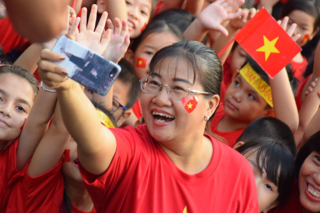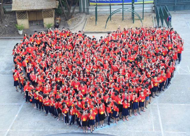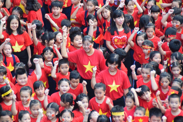 Từ hiệu trưởng, giáo viên, học sinh các em cùng mặc áo cờ đỏ sao vàng, đeo băng rôn đỏ, dán cờ sao vàng năm cánh lên má, tay cầm lá cờ… Tất cả tạo nên một màu đỏ rực rỡ giữa sân trường.