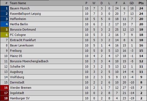 Sau 10 vòng đấu, tân binh Bundesliga đang bất bại và tạm thời xếp thứ hai với 24 điểm. Họ có cùng điểm số với đội đầu bảng Bayern Munich nhưng đành xếp sau do thua chỉ số phụ. Đây là lần đầu tiên sau 6 năm mới có một đội bóng cân bằng điểm số với “Hùm xám” sau 10 vòng đầu tiên. Và cũng từ khá lâu rồi bóng đá Đức mới lại có một tân binh thi đấu ở giai đoạn đầu mùa ấn tượng đến vậy. Lần gần nhất có một tân binh như vậy là Kaiserslautern ở mùa giải 1997-98. Mùa giải năm đó, tân binh Kaiserslautern sau 34 vòng đấu đã vô địch Bundesliga khi chỉ hơn đội đứng thứ hai Bayern Munich đúng 2 điểm.