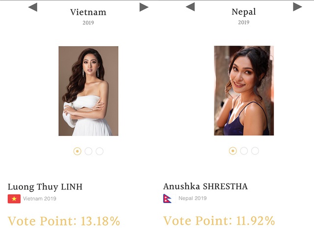 Càng bất ngờ hơn khi Lương Thùy Linh hiện đã lên Top 1 bình chọn tại website Hoa hậu Thế giới với 13.18%, so với 11.92% của đại diện Nepal đang ở vị trí thứ 2.