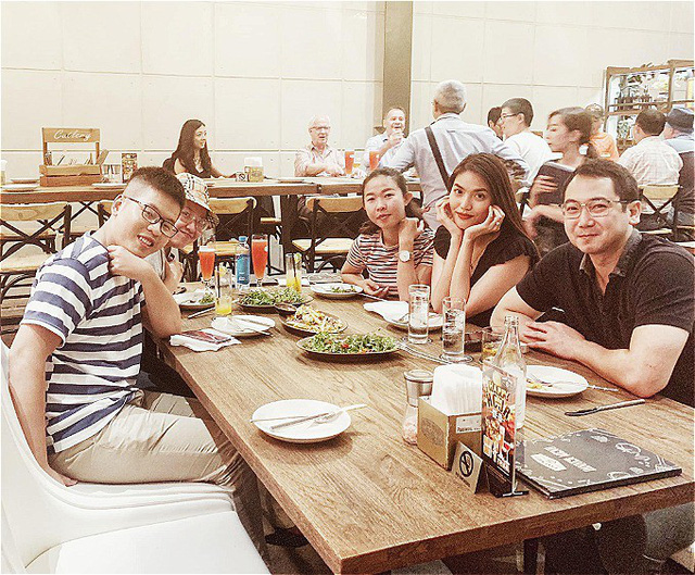 Lan Khuê và ông xã Tuấn John đi ăn cùng những người bạn. người đẹp hài hước bình luận về bức ảnh: "Cuối tuần ăn ngon, uống đã, khẩu nghiệp tràn trề".