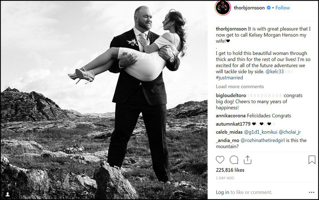 Nam diễn viên Thor Björnsson đã vừa kết hôn với bạn gái Kelsey Henson. Thor (29 tuổi) đã khẳng định tin vui này trên tài khoản mạng xã hội vào cuối tuần qua với dòng trạng thái: “Đây là niềm hạnh phúc vô bờ khi giờ tôi có thể gọi Kelsey Morgan Henson là vợ!”.