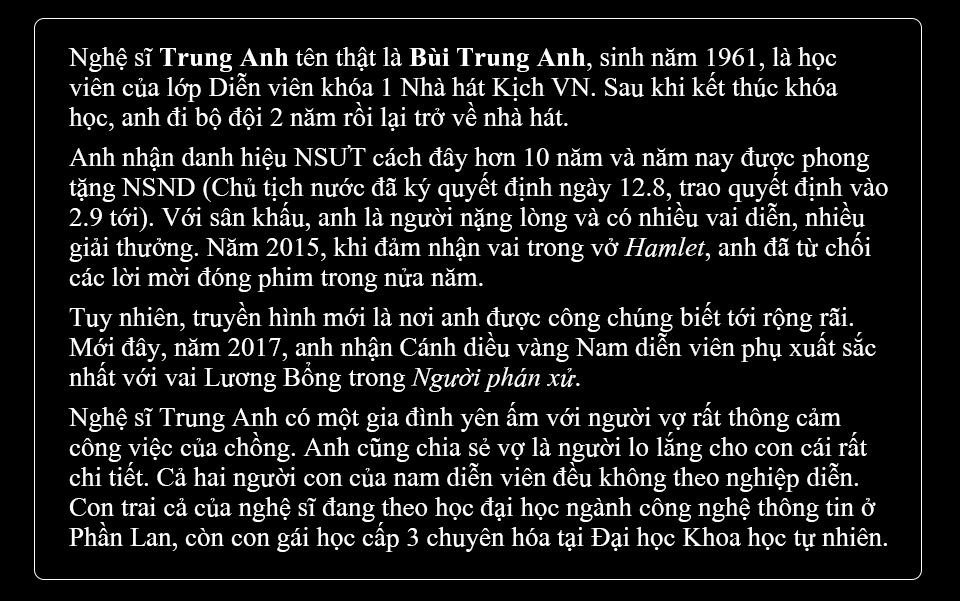 Hoặc vở Nguyễn Trãi ở Đông Quan, chú Nguyễn Đình Nghi làm đạo diễn. Hôm đấy rét quá, tôi đóng lính mặc một cái áo mỏng lắm. Nên tôi mặc áo len mỏng ở trong rồi mặc áo mỏng của lính ra ngoài, cài kín nhưng chú Quang Thái ra bảo mày mặc thế này không được, phải hy sinh vì nghệ thuật chứ. Thế là tôi vào trong, cởi luôn áo len ra. Các chú ấy quá nghiêm túc với từng chi tiết như thế. Nên tôi đã thực sự coi Nhà hát Kịch VN không chỉ là ngôi nhà thứ hai. Đã có lúc muốn bỏ đi, chuyển sang đơn vị khác nhưng rồi những chuyện xưa làm mình không thể làm thế được.