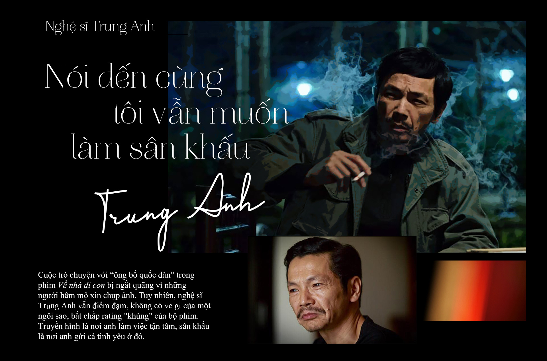 Nhiều lúc, tôi cứ nghĩ mình sang làm phim truyền hình hay cả phim điện ảnh chỉ là sang làm chơi thôi. Công việc của mình vẫn là sân khấu. Có lẽ là vì xuất phát điểm làm nghề ở tại Nhà hát Kịch VN, lại học với các cô các chú mà đến giờ vẫn là thế hệ giỏi nhất của sân khấu Việt. Chú Nguyễn Đình Nghi, người làm việc không ai nghiêm túc hơn. Hay những nghệ sĩ quá tài năng như chú Trọng Khôi, chú Đoàn Dũng, cô Mỹ Dung... Thời kỳ đó, ai ai cũng biết đến họ dù họ chỉ làm mỗi sân khấu thôi.