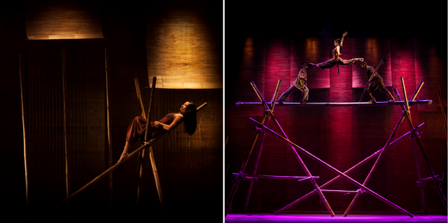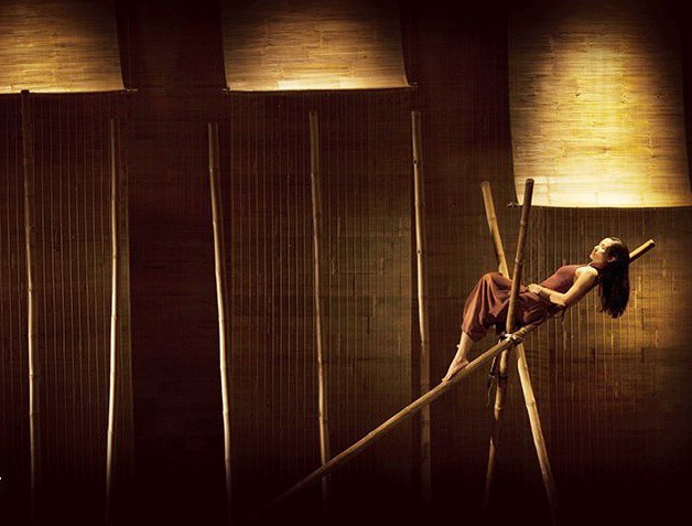 Chỉ với 14 thân cây tre trong tay 14 diễn viên khi là xà ngang, xà dọc, để diễn viên xiếc đu bám, đùa vui nghịch ngợm. Hàng chục thân tre đủ mọi kích cỡ, liên tục được dàn xếp, sắp đặt biến hóa trên sân khấu, khi thì thành cầu tre lắt lẻo, khi lại hóa thành một con mảng đang trôi trên sóng nước dập dềnh, khi thành sườn nhà, khi thành vách tường che chở cho con người. Diễn viên tung hứng, đu mình trên những thân tre, đu dây trên rừng cọc tre khi xòe ra, khi khép lại như ôm ấp.