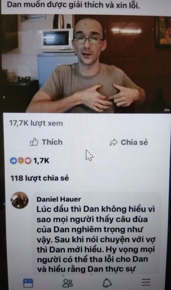 Theo lời của Dan chia sẻ trong clip, “lúc đầu Dan không hiểu vì sao mọi người thấy câu đùa của Dan nghiêm trọng như vậy. Sau khi nói chuyện với vợ thì Dan mới hiểu. Hy vọng mọi người có thể tha lỗi cho Dan và hiểu rằng Dan thực sự không có ý xấu.